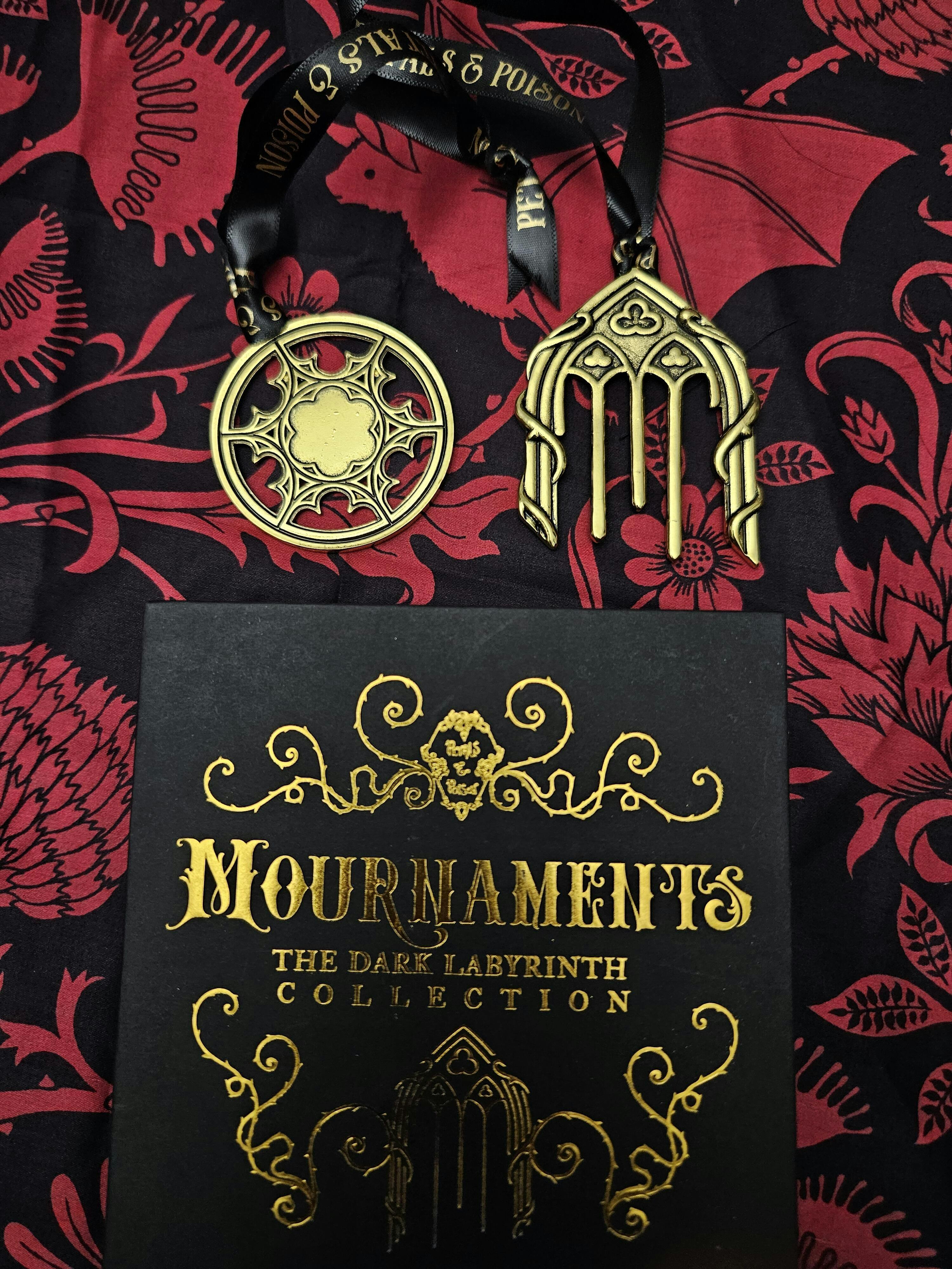 Created from the heart of our parlor comes our Mournaments™: A gothic decoration for the dark of winter. Meticulously made from electroplated Kirsite (zinc-aluminum alloy), hung from a black satin ribbon. (Lead free!)