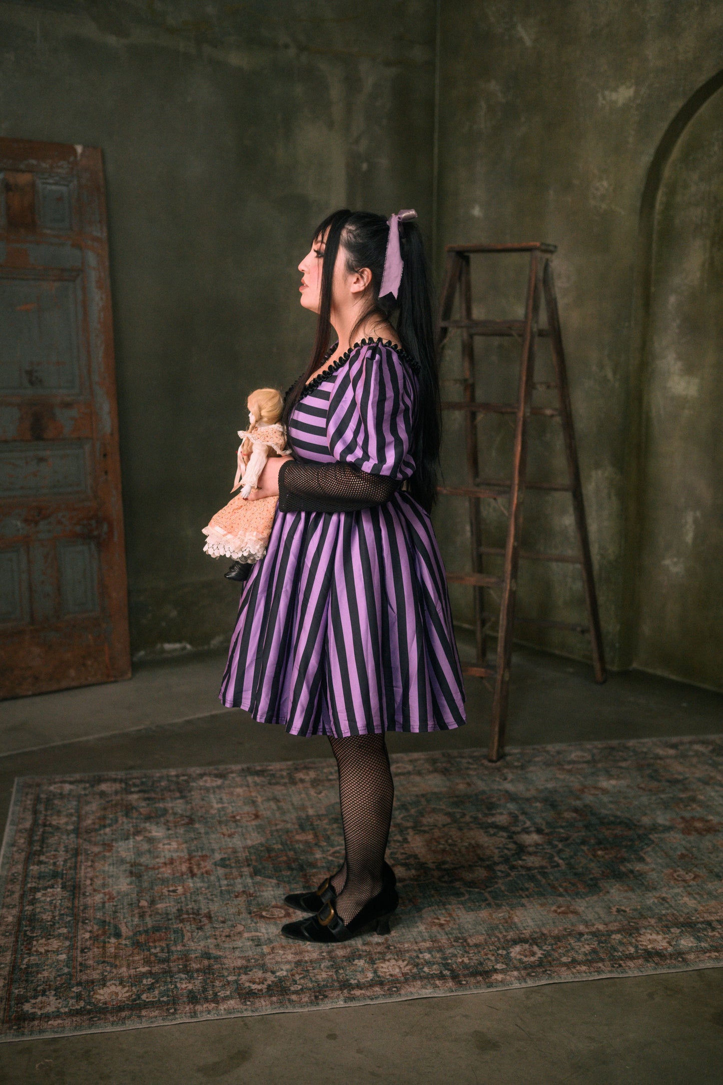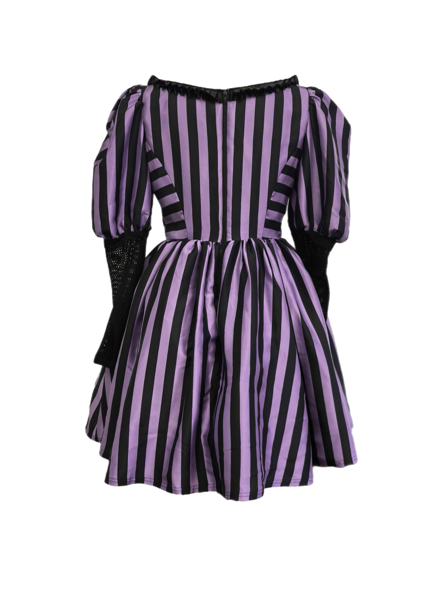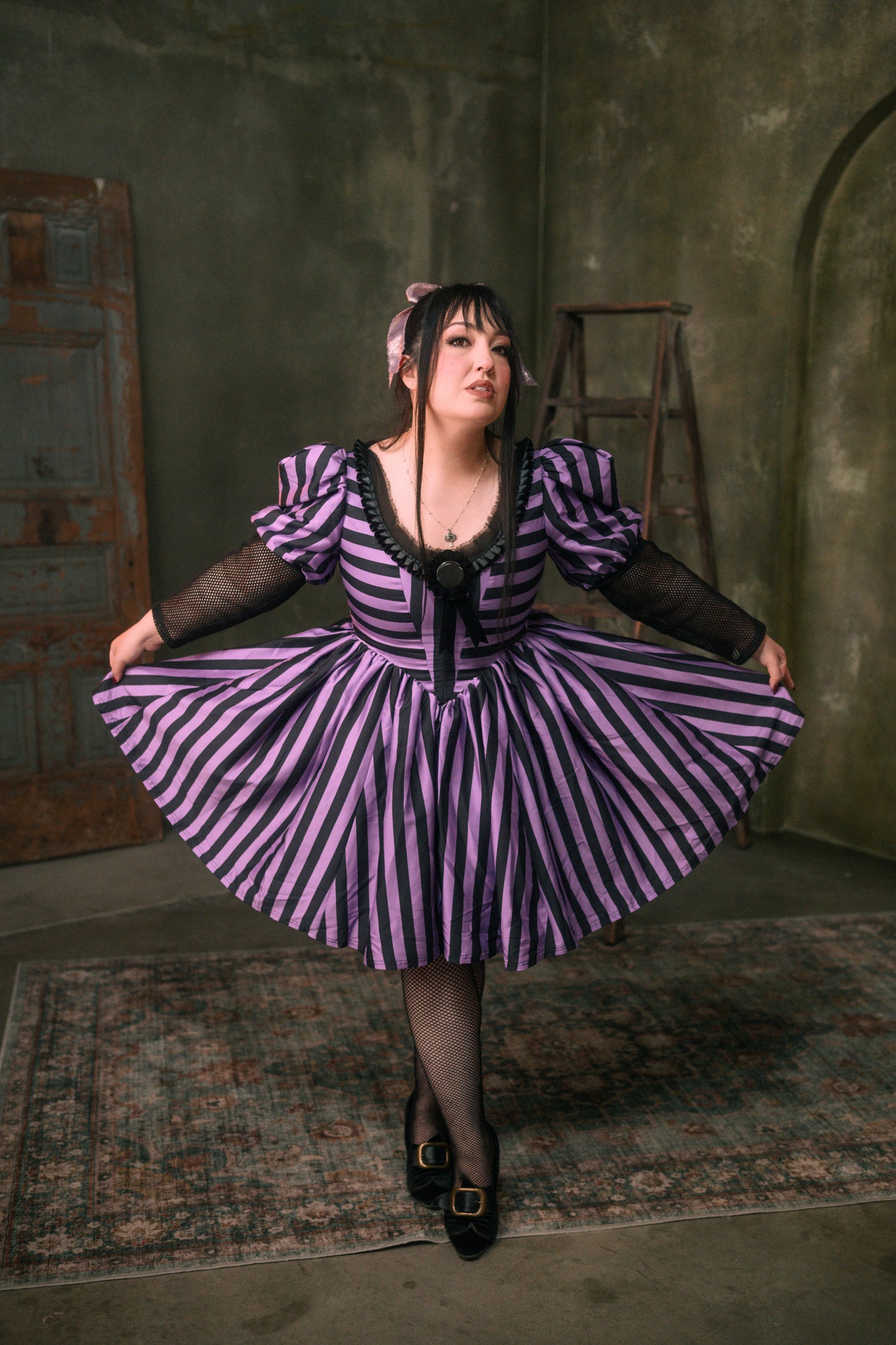 Crafted with princess seams to embrace the figure, it features a dramatic drop waist, voluminous puff sleeves lined in sheer black fishnet, and generous 6" deep pockets: room for your phone, a wallet, or a folded love letter. A detachable ribbon brooch adorns the neckline, allowing you to style the piece with or without its flourish.