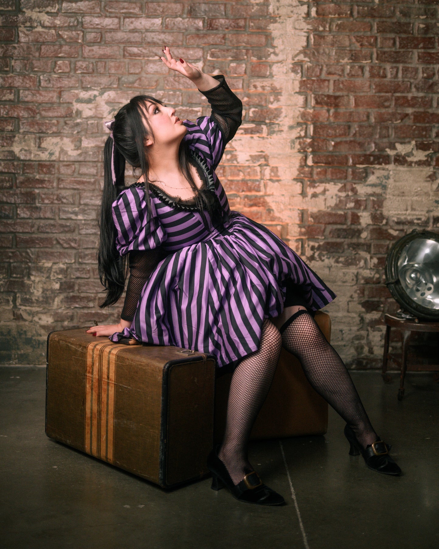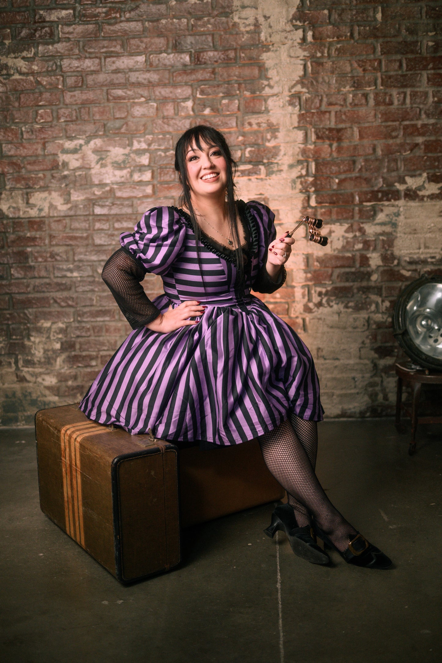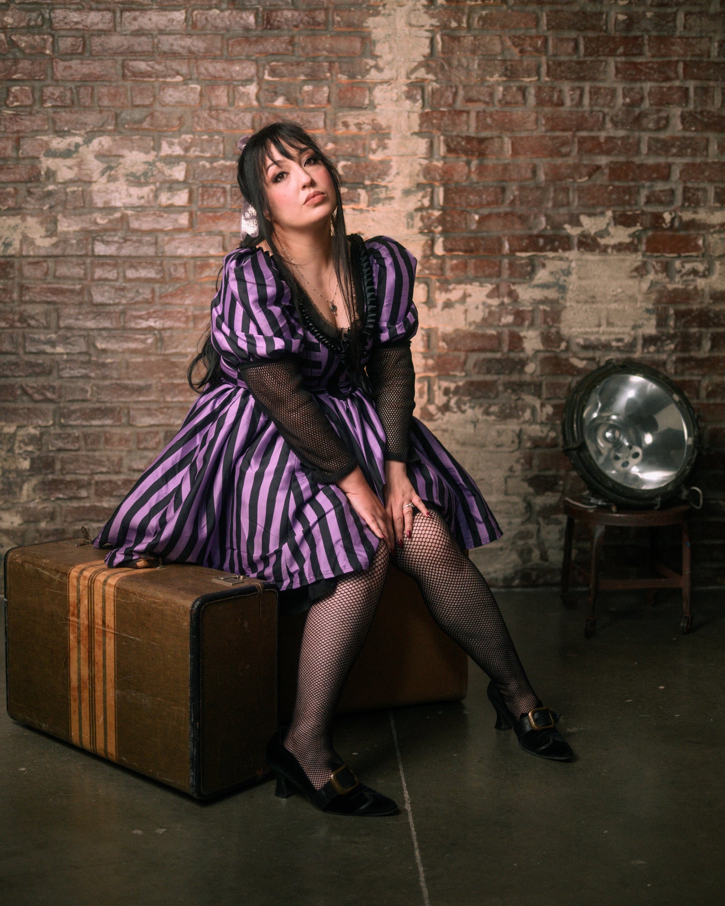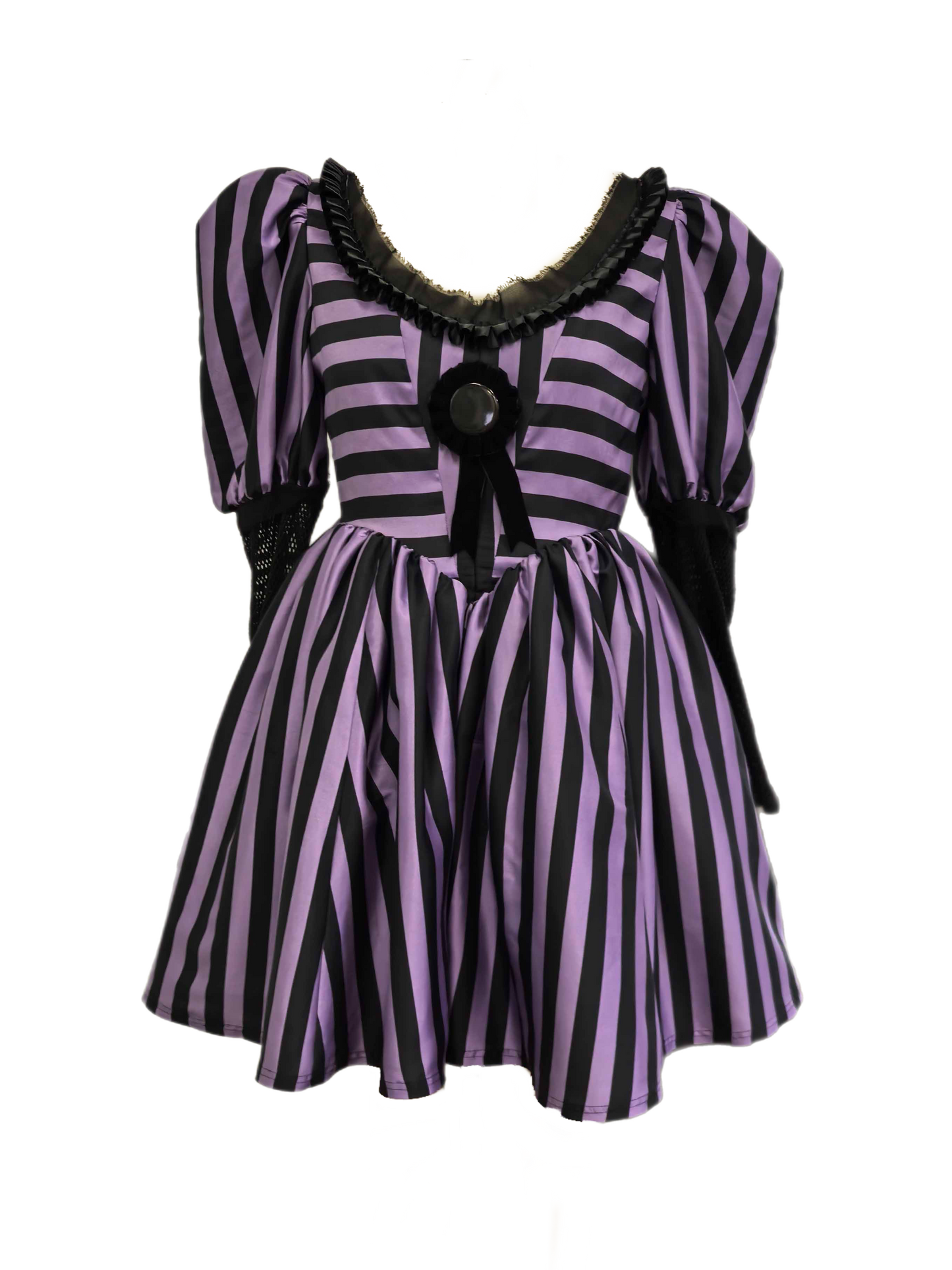 Crafted with princess seams to embrace the figure, it features a dramatic drop waist, voluminous puff sleeves lined in sheer black fishnet, and generous 6" deep pockets: room for your phone, a wallet, or a folded love letter. A detachable ribbon brooch adorns the neckline, allowing you to style the piece with or without its flourish.