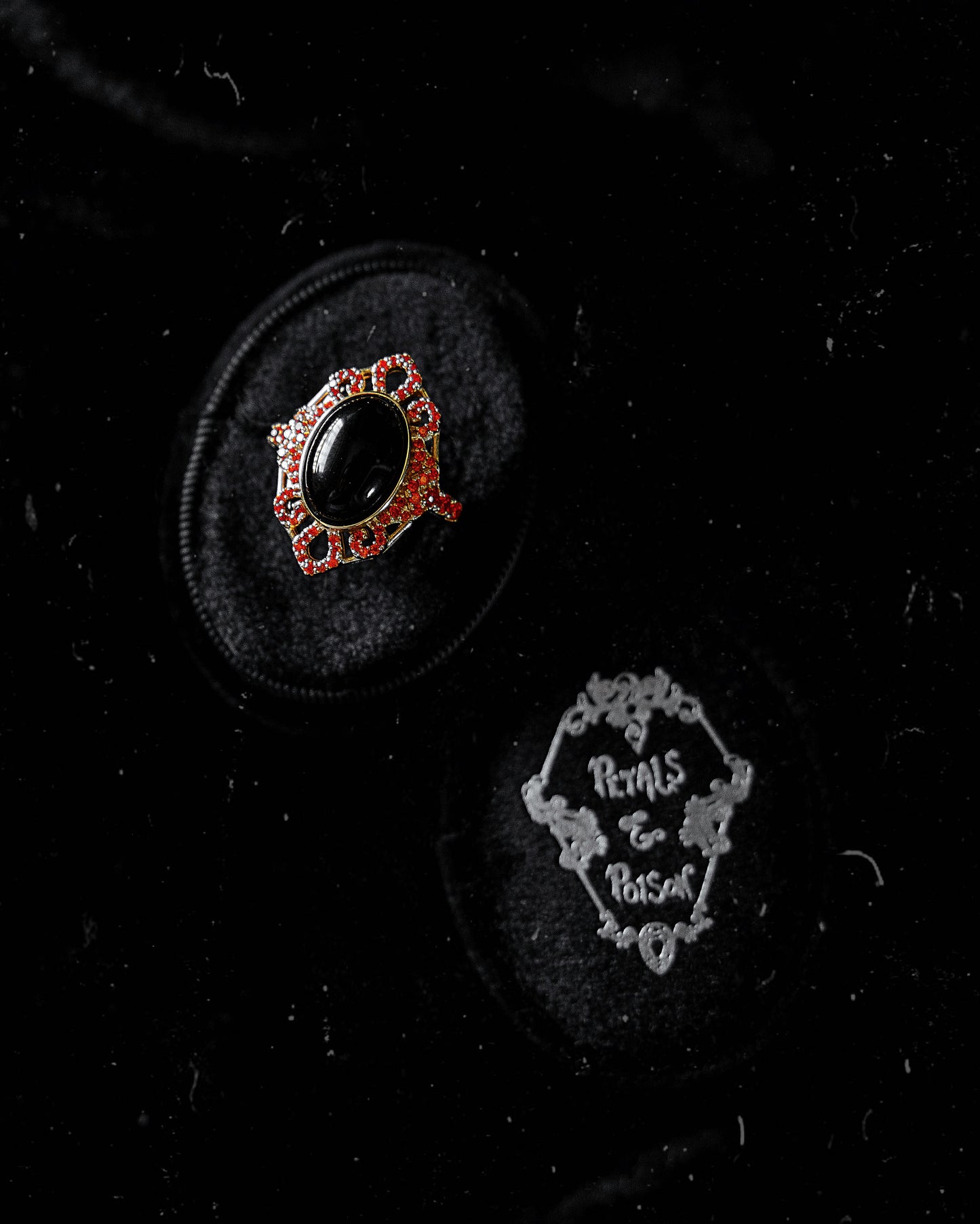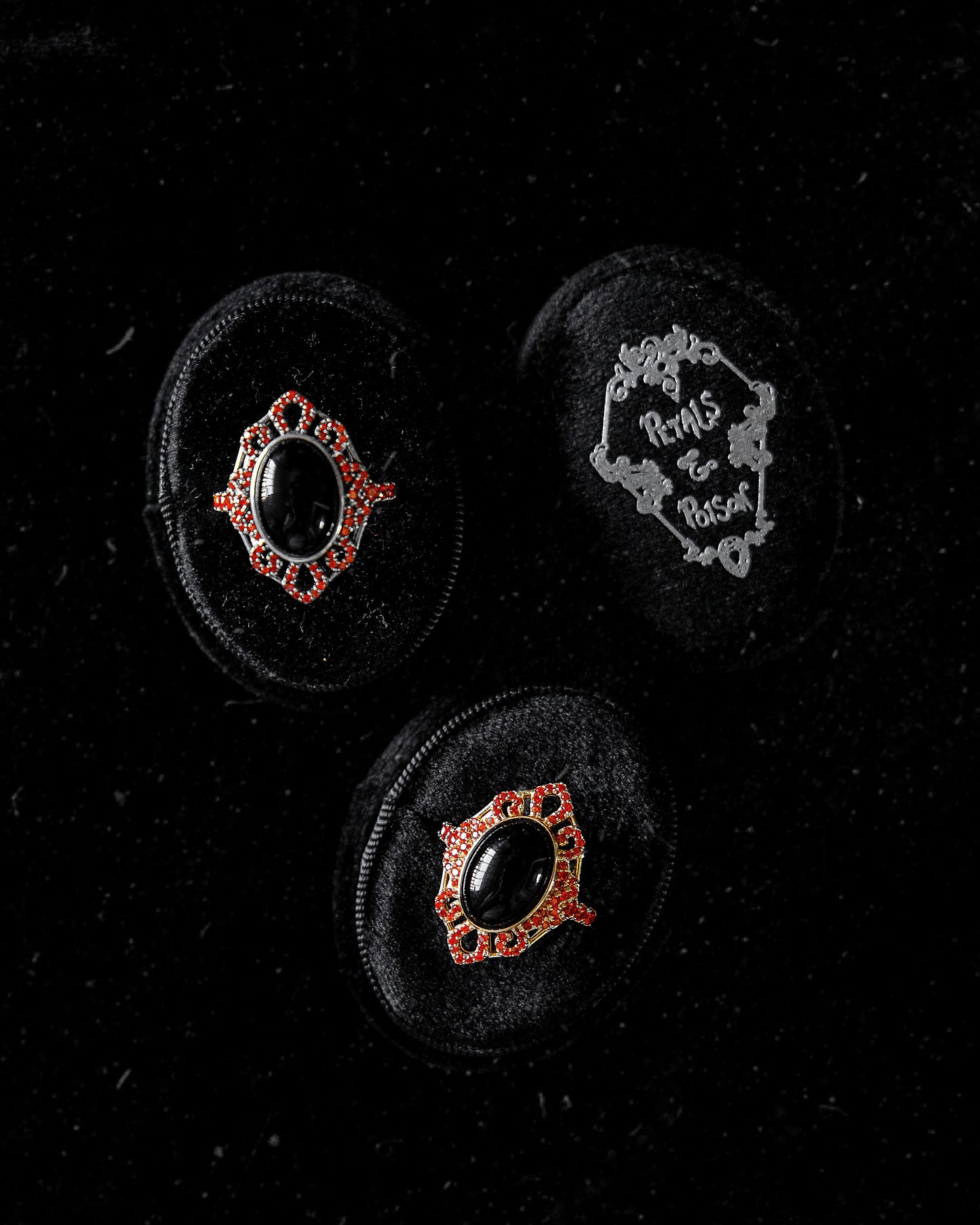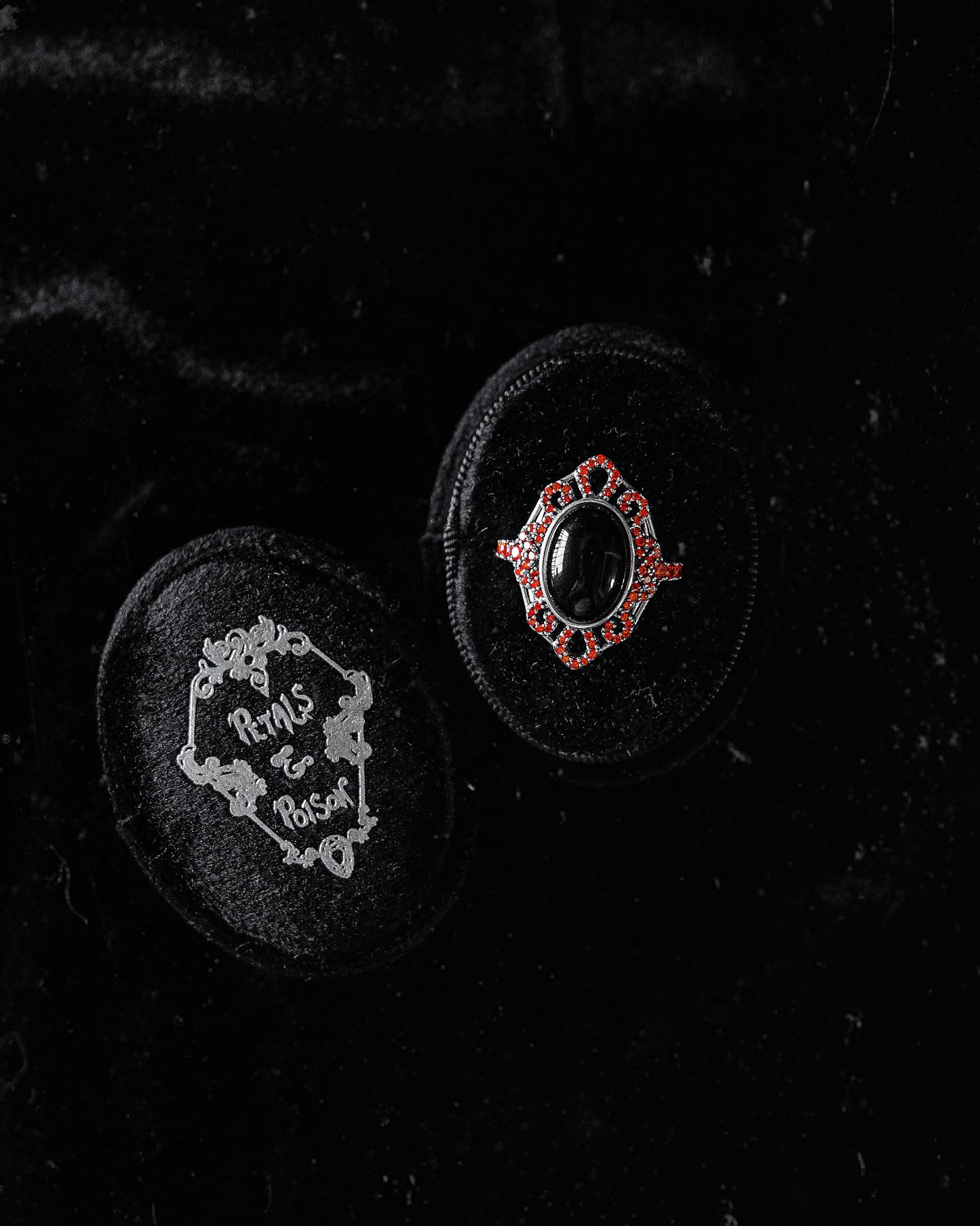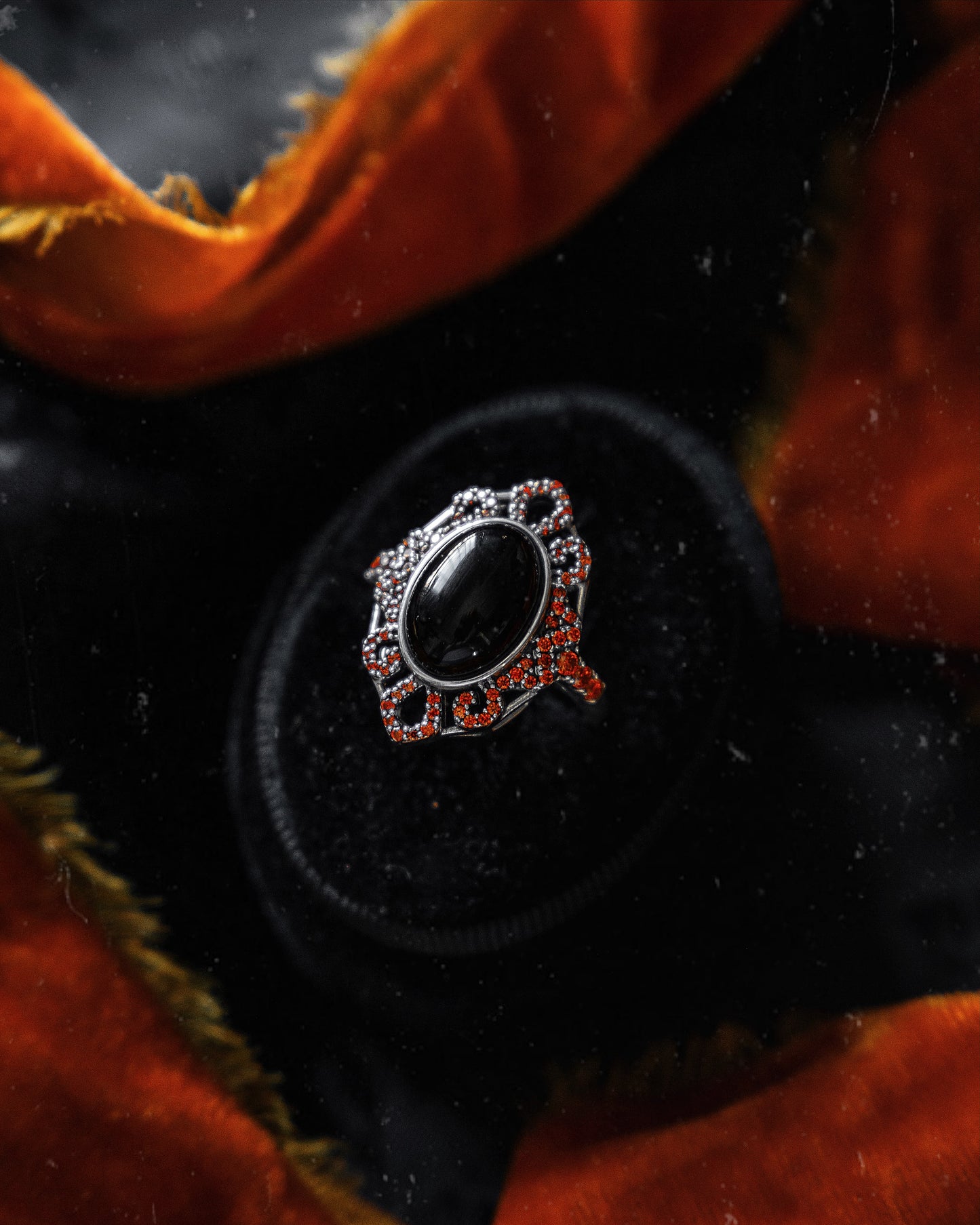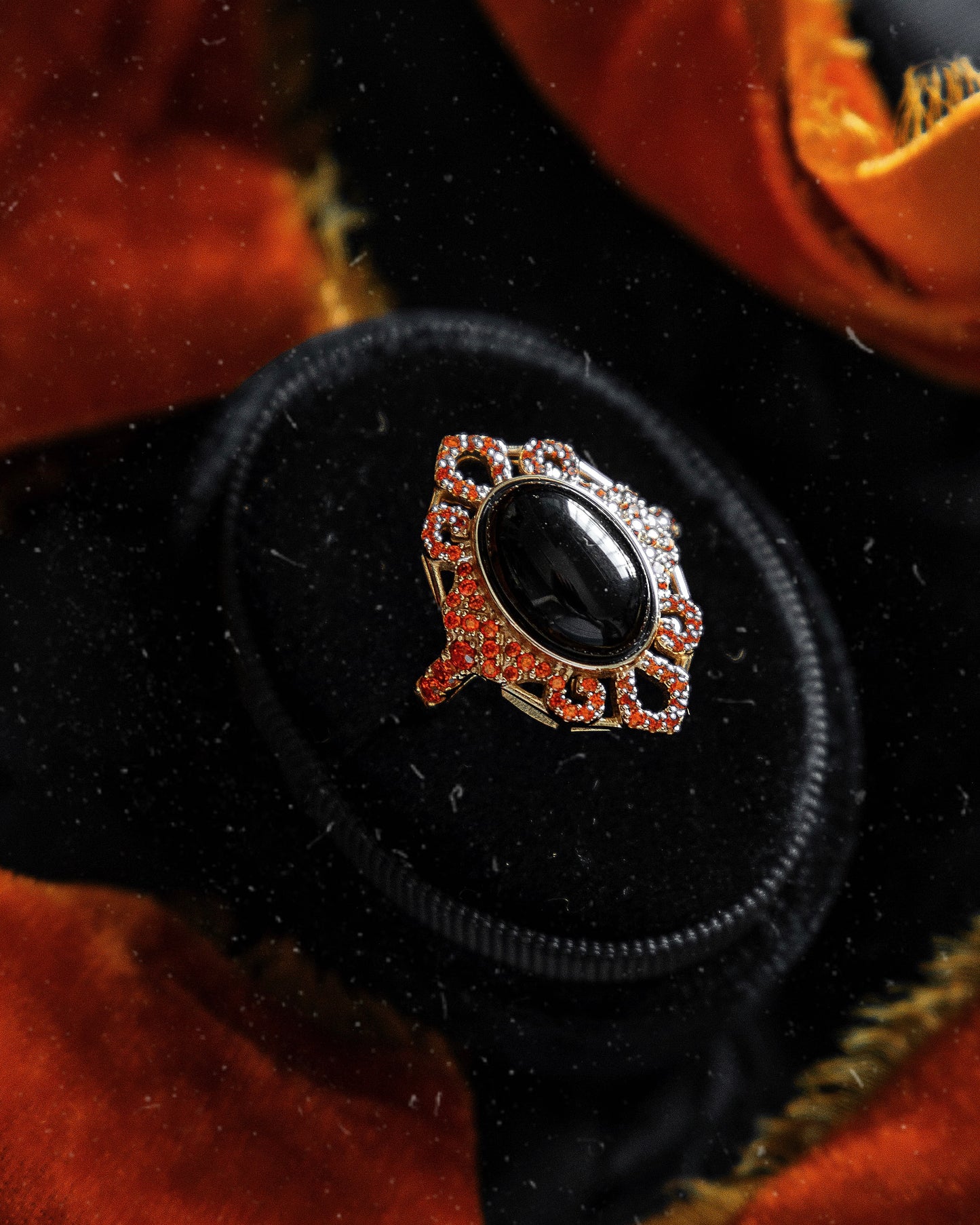 Crafted in your choice of solid 925 sterling silver or 14k gold-plated sterling silver, it features a black oval glass center stone crowned by glowing orange cubic zirconia.