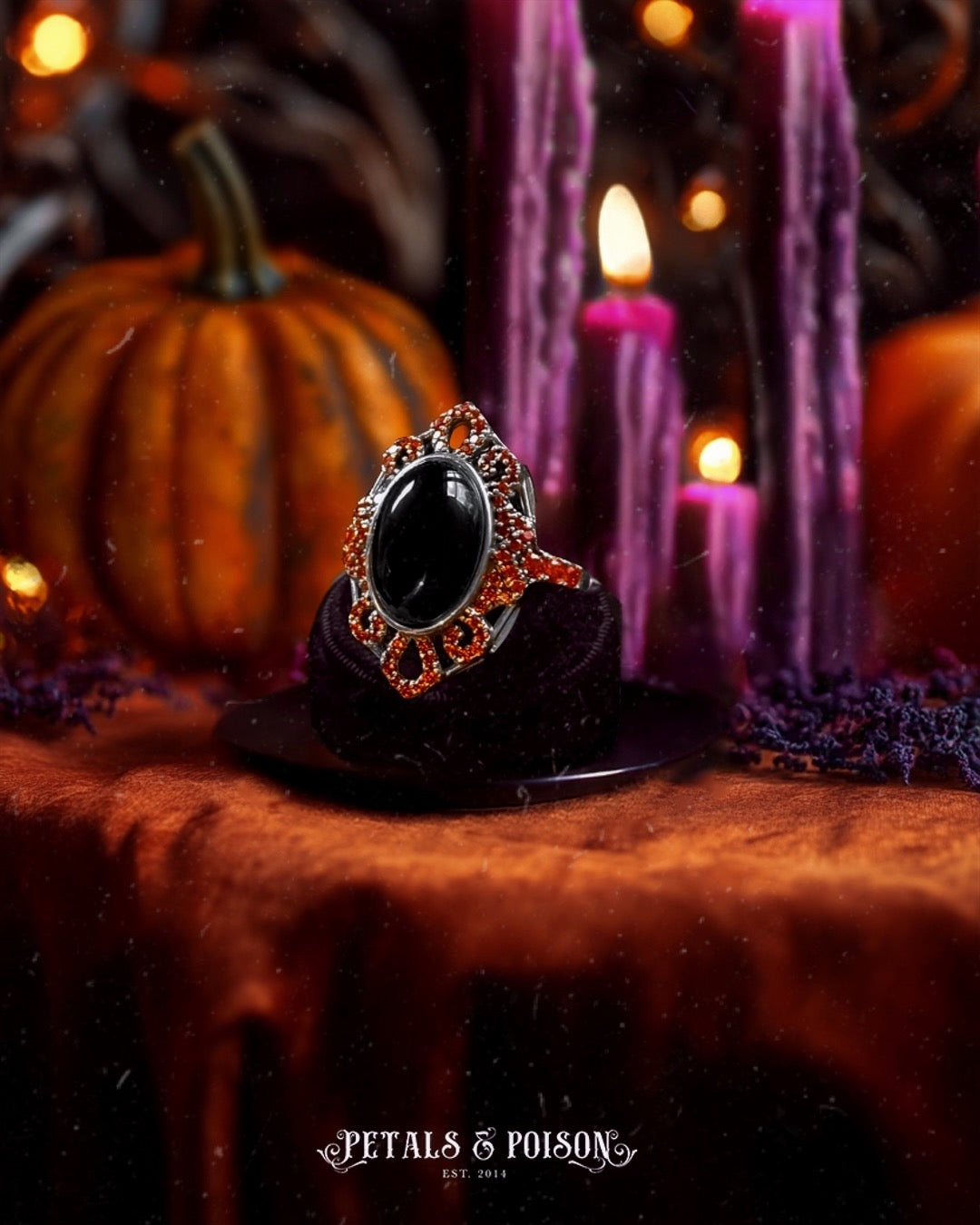 A gothic nod to the vintage Halloween aesthetic, this heirloom-inspired piece captures the spirit of the season with a refined palette of onyx and ember.