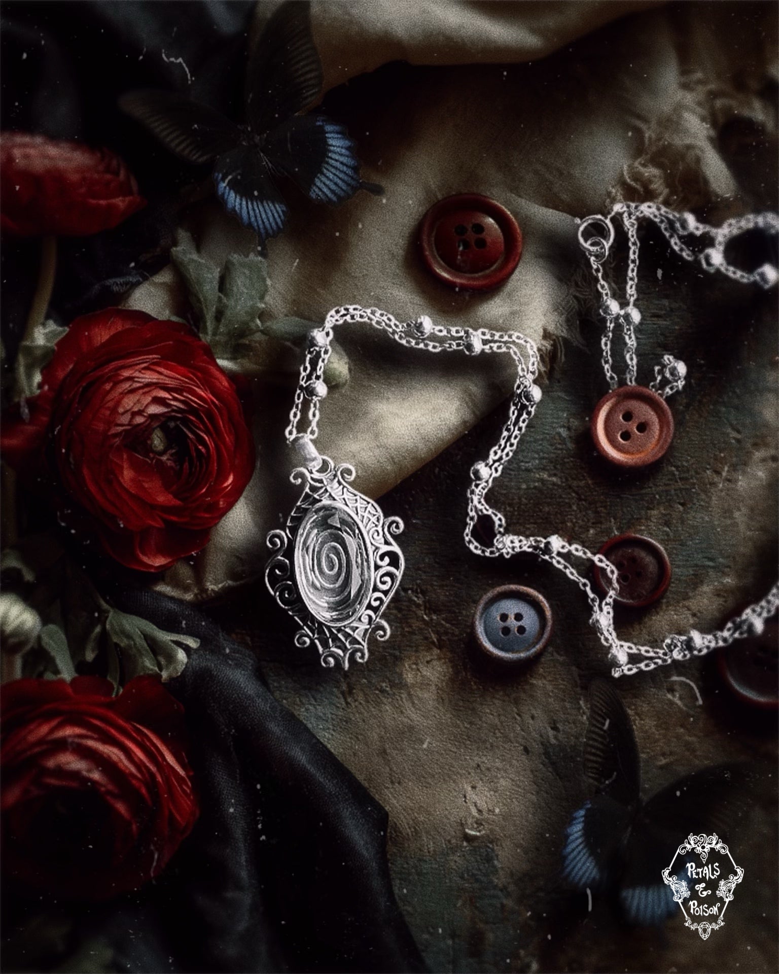 The Whimsigoth necklace captures a dreamlike swirl, preserved within an oval glass casket. Encircling it are whimsical spiderwebs, sculpted into silver that coils and curves in endless swirls, mirroring the whimsy of a dreamy wonderland.